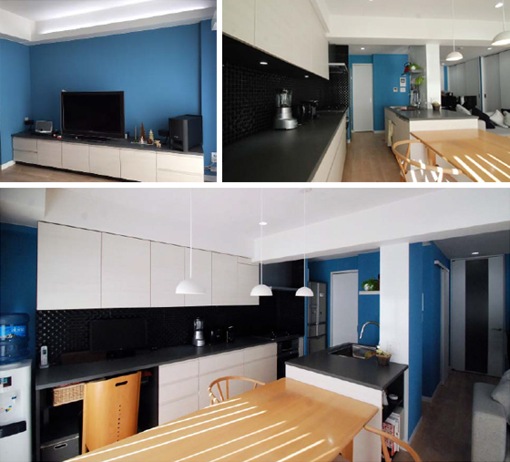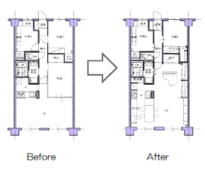 大型分譲マンションの3階。ライフスタイルの変化に合わせ、3LDK→2LDKにプラン変更し、ほぼ全面改装。ブルーと白を基調としたさわやかなテイストとした。配管上必要な箇所以外の床はすべてフラットとし、主婦の使い勝手にあわせた動線計画とレイアウトとしている。寝室以外は極力オープンとし、通風・採光等の環境もさらに改善。