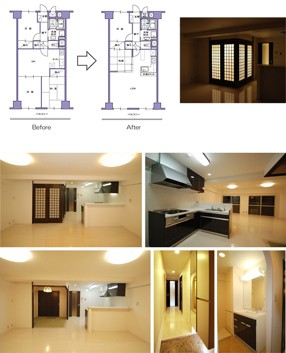 | 築33年大型分譲マンションの4 階の3LDK を購入。夫婦と犬の3 人( ? ) 暮らしに合わせ間仕切りを含み内装を大幅に変更。白を基調とした和風モダンなテイストとした。段差のあった床はすべてフラットとし、バリアフリー化を図る。昔ながらのキッチンはオープンとし、和室(寝室となるのだが)もオープンにすることで、23 帖ほどの大空間を実現した。洋室-和室間のクローゼットは両方から使用できるようにすることで、効率利用を図った。和室の格子から漏れる光が、まるで大型の行灯のようである。 |